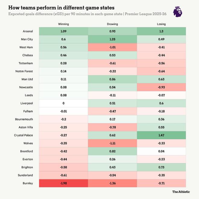 利物浦在追赶比赛时最具威胁,平均每90分钟净xG为0.6,但这些时段通常会演变成混乱的对攻战。当他们落后时,进攻输出从每90分钟1.4 xG跃升至2.05 xG,但防守数据恶化,从0.89滑落至1.4。