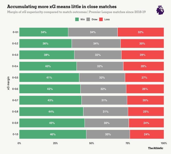 为了说明这一点,The Athletic研究了自2018-19赛季以来超过2800场英超比赛的xG差值,并将其与实际结果进行比较。当差值小于1时,xG更高的球队获胜的概率仅为46%,比抛硬币的概率还低。