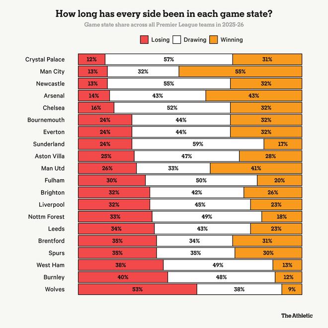 可以将维拉的比赛效率与垫底的邻居狼队进行对比。狼队积累了大量“无效机会”——他们超过三分之一的xG来自落后两球或更多时,这有助于他们在xG榜单上支撑排名,但对于赢得实际积分作用有限。