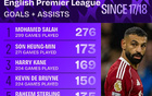 17/18赛季以来英超参与进球数榜:萨拉赫第一,孙凯分居二三
