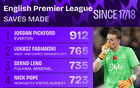 英超自17-18赛季以来门将扑救榜:皮克福德第1,德赫亚上榜
